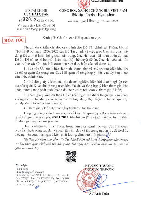 Thực hiện chỉ đạo của Cục Hải quan tại Công văn số 32052/CHQ-GSQL ngày 28/10/2025 về việc lấy ý kiến của cộng đồng doanh nghiệp và các hiệp hội trên địa bàn liên quan đến chủ trương triển khai Đề án mô hình thông quan tập trung,